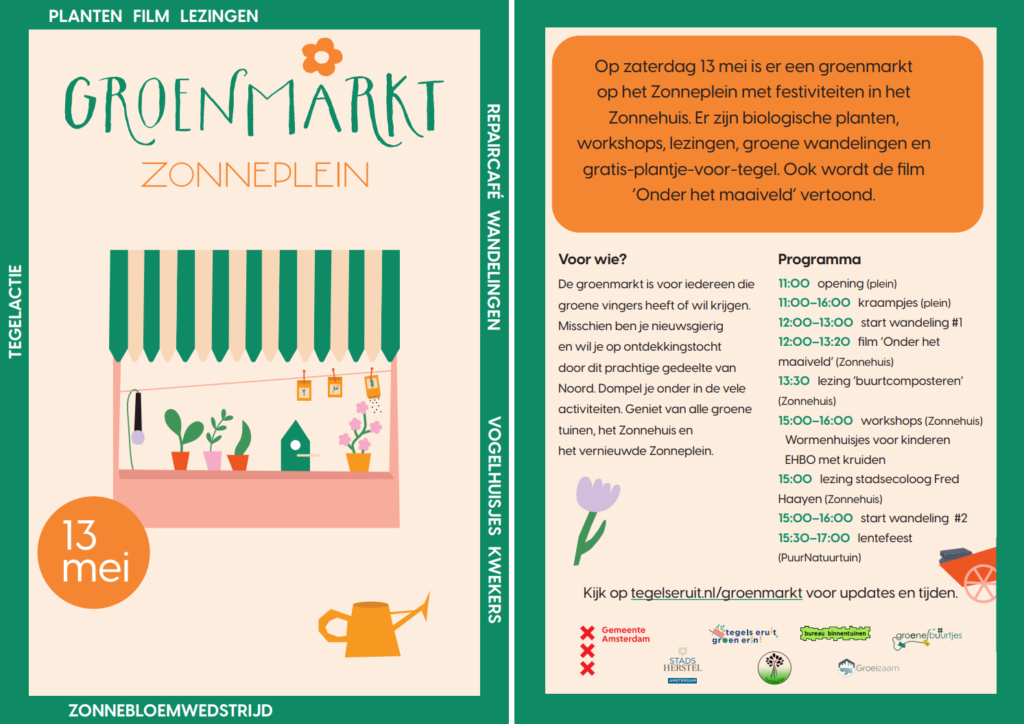 De groenmarkt is voor iedereen die groene vingers heeft. Maar juist ook voor mensen die net beginnen met het vergroenen van de tuin. Uiteraard is de groenmarkt er ook als je dit prachtige gedeelte van Noord wilt zien, en alle groene activiteiten die er zijn. In de groene tuinen, en nu dus ook op het vernieuwde groene Zonneplein en Zonnehuis. Op onderstaande flyer vind je het programma voor 13 mei.