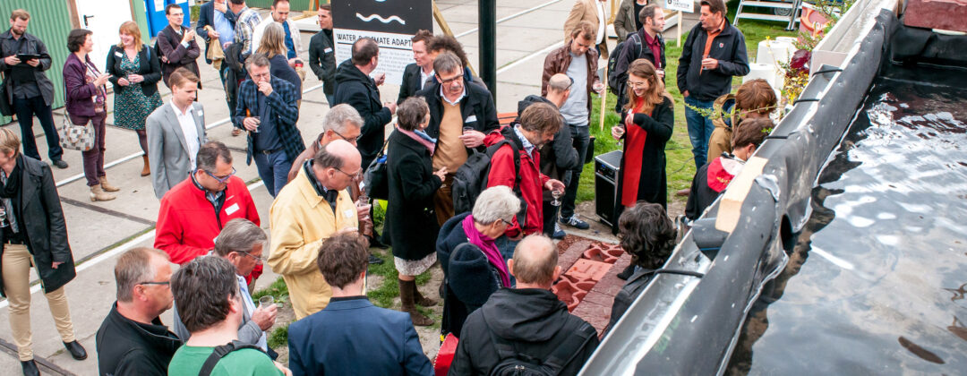 Daniel Goedbloed, programma manager Rainproof, en Ariane Hoog introduceerden vervolgens het Rainproof paviljoen. Beiden gaven aan dat de basis voor een regenbestendige stad ligt in de samenwerking van een breed stedelijk netwerk van partijen. Het paviljoen toont hoe het bedrijfsleven, ambtenaren en bewoners gezamenlijk maatregelen kunnen nemen om de sponswerking van de stad te vergroten, schade te voorkomen en regenwater te benutten voor een mooie, leefbare stad.