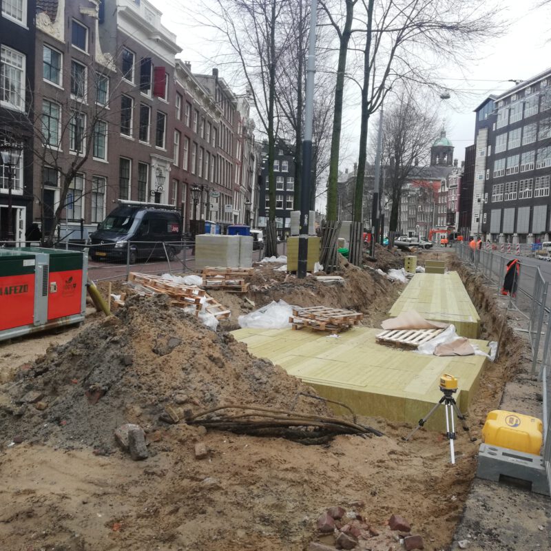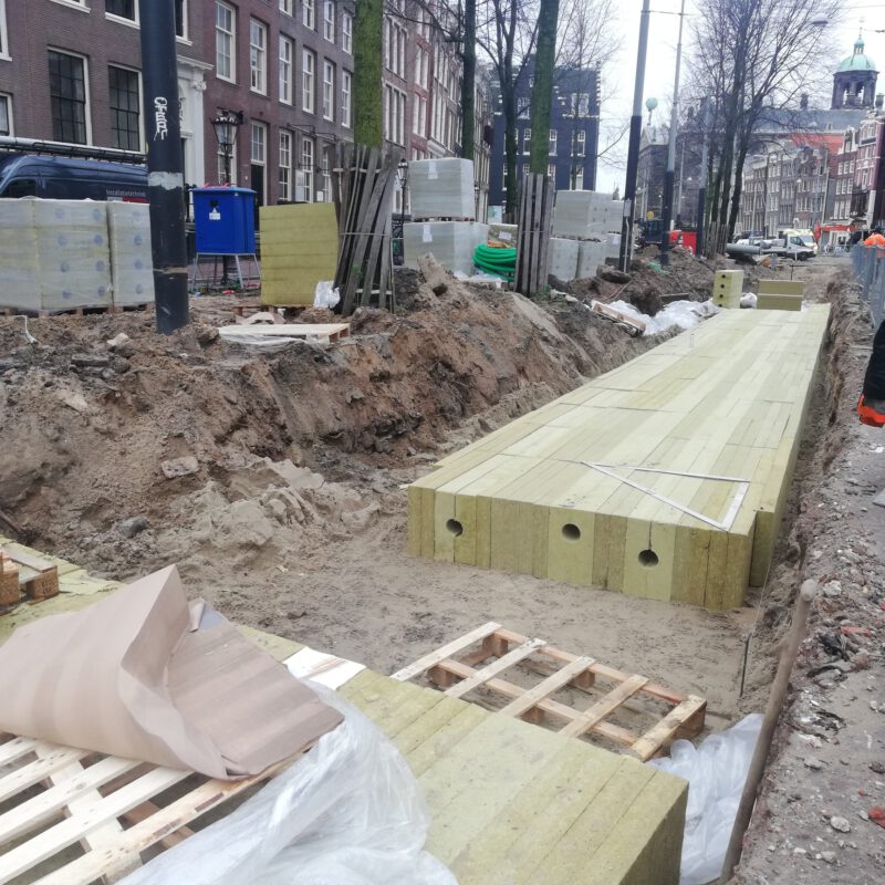 Het water kan dus snel van de straat afgevoerd worden, waarna het rustig in de bodem kan infiltreren. De waterberging is na 2 à 3 dagen beschikbaar voor een nieuwe hoosbui. Daan Los, adviseur Stedelijke Klimaatadaptatie bij Rockwool, vertelt: ’Aangezien de buffervelden direct onder het betonnen onderbed van de trambaan liggen er een sterker type Rockflow toegepast dan bij de Nieuwe Zijde Zuid. Hierin kan echter nog steeds 94 procent van het volume aan water gebufferd worden. Daarnaast is het een volledig circulair product met een lage MKI-waarde.’