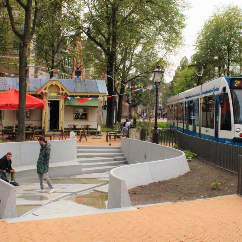 Wijbrand: ‘Bij de herinrichting van het zuidelijke deel van de Nieuwezijds Voorburgwal – van de Paleisstraat tot het Koningsplein – hebben we onder andere op kwetsbare plaatsen de stoep verhoogd. Zo stroomt het water van de huizen vandaan in plaats van andersom. Bij de Postzegelmarkt, waar het zogenoemde ‘Postzegelparkje’ is aangelegd, komen alle onderdelen van klimaatadaptatie samen. ‘Er zijn groenvakken aangegeld waaronder Rockflow is toegepast. Bovenop de Rockflow-elementen onder de plantvakken zijn mermavoid kratjes van Tree Ground Solution aangebracht, waaruit de planten in droge tijden water kunnen halen.