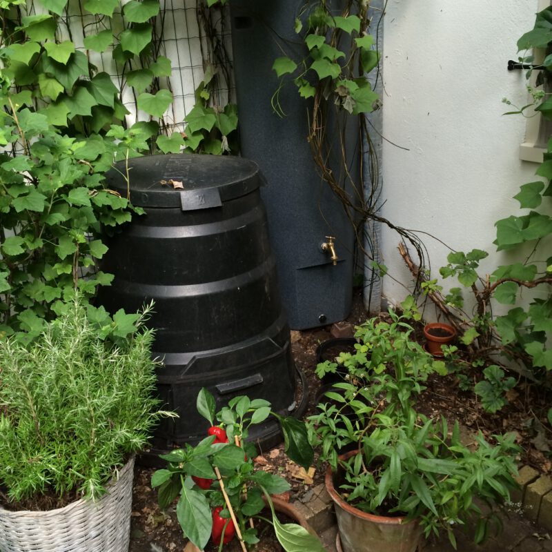 Aan de voorkant van ons huis de drukke stad, met vervuilend vrachtverkeer en rondvaartboten creëerden wij aan de achterkant van ons huis een oase van rust en groen. Duurzaam en bewust leven, biologisch eten en een groene levenshouding is voor stadsmensen immers net zo goed mogelijk als voor mensen die ‘buiten’ wonen. Omdat wij zuinig zijn met water, en toch een vast bedrag aan het Waternet voor het kraanwater betaalden, hebben we om te beginnen een watermeter aan de waterleiding laten plaatsen. Voor de tuin vangen we regenwater op in een regenton. Voor planten is regenwater uit de ton immers veel lekkerder dan water uit de kraan. Het is voedzamer, zachter en bovendien gratis. We zijn voor wat betreft ons kraanwater veel goedkoper uit dan voorheen.