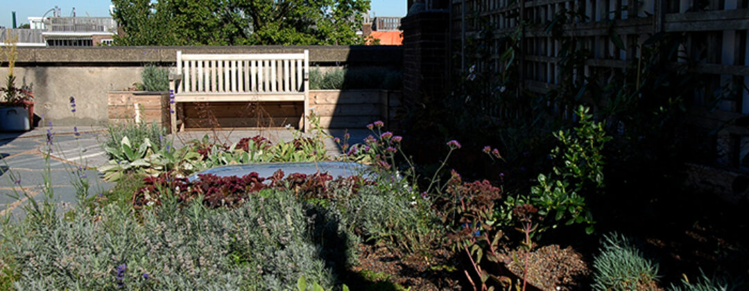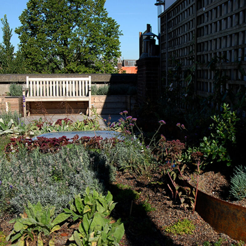 In Amsterdam Zuid ligt een Engelse daktuin. De daktuin is een polderdak: een groen dak met onder de substraatlaag een extra laag om regenwater te bergen.