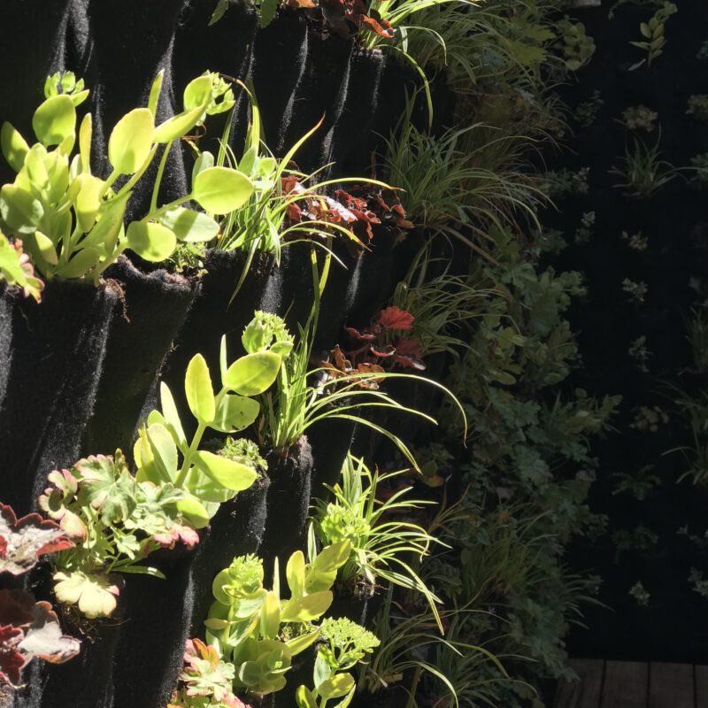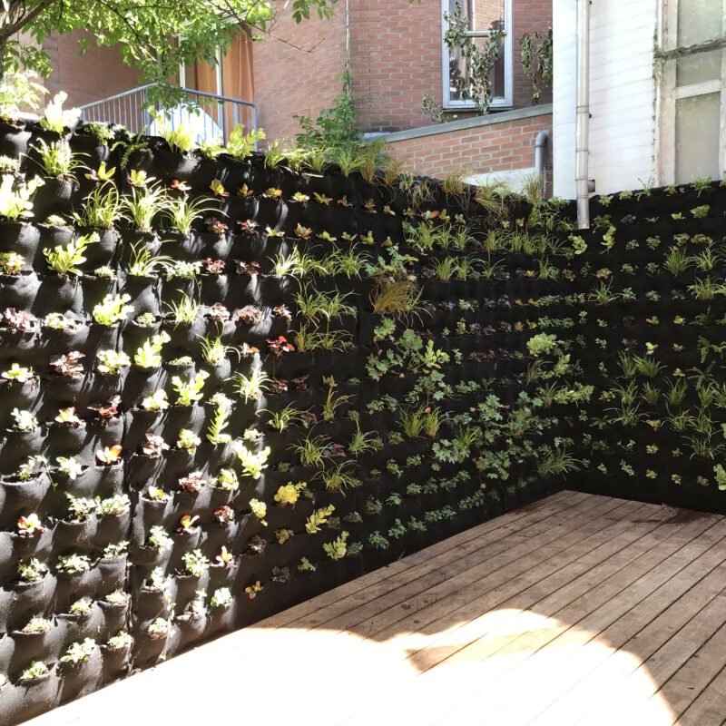 Deze achtertuin had niet alleen een make-over nodig. Er moest ook een extra waarde aan toegevoegd worden volgens de eigenaar. Vanwege de toename van extreme weersomstandigheden is in samenwerking met Deverticaletuinman en De Groene Wand gekozen voor een groene gevel van maar liefst 26m2. Niet alleen zorgt dit voor een verkoelend effect wanneer het warm is, ook kunnen er insecten in leven wat de biodiversiteit ten goede komt. Daarnaast heeft deze oplossing volgens velen een hoge esthetische waarde.