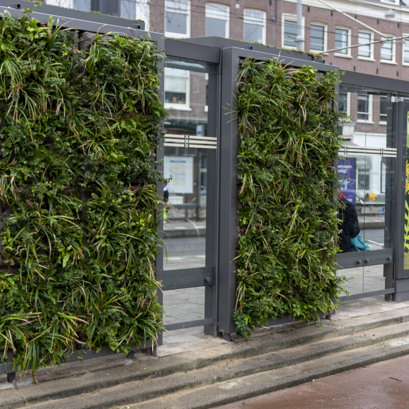 Sinds januari 2020 heeft Amsterdam groene, weerproof tramhaltes. De verharding van de stad zorgt ervoor dat wateroverlast steeds meer een probleem begint te worden. In de schaarse ruimte van de stad heeft de gemeente Amsterdam een creatieve oplossing gevonden; groene abri’s, een tramhalte met waterberging, groen dak én een groene verticale wand.