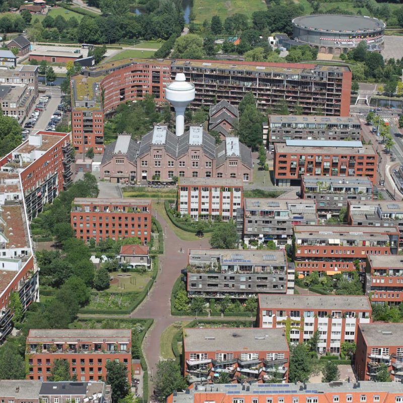 De wijk wordt omzoomd door twee grote flatgebouwen, die dienen als wind- en geluidsbuffer voor het binnenterrein, waar kleinere woonblokken staan. Deze beide grote gebouwen hebben sedumdaken. Kenmerk daarvan is dat die bij regen het water langer vasthouden, zodat niet meteen na een zware regenbui het water op grondniveau komt.