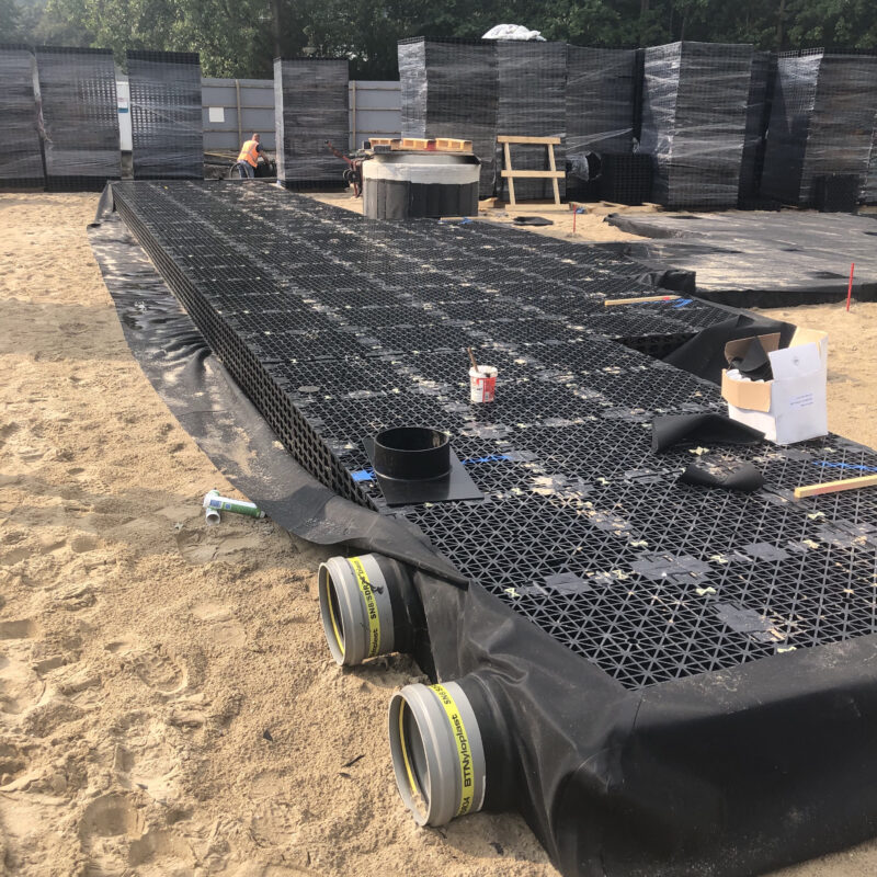 Tijdens een regenbui stroomt het regenwater in de straatkolken van het fietspad de infiltratiekratten in. Er zijn twee secties kratten geplaatst, de eerste ligt op de parkeergarage en zit hoger. De andere kratten liggen lager als tweede buffer, als ook deze vol zitten is er een overstort naar het riool. Het grote voordeel van de toepassing van deze kratten is dat er weinig ruimte bovengronds wordt ingenomen. Het biedt een passende oplossing voor het versteende gebied van de RAI om regenwateropslag te realiseren.