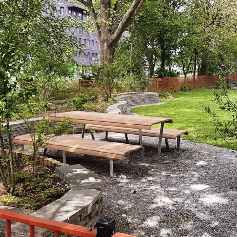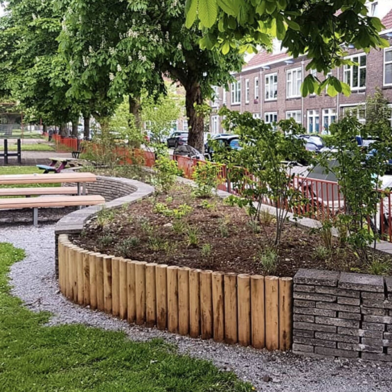 Gerecyclede stoeptegels vormen de rand van de groenvakken en zijn op zithoogte gemaakt waardoor ze tegelijk dienen als bankje. Door de verhoogde vakken zijn de planten ook beter beschermd tegen mensen die erdoorheen zouden lopen of ballen die er per ongeluk inrollen.