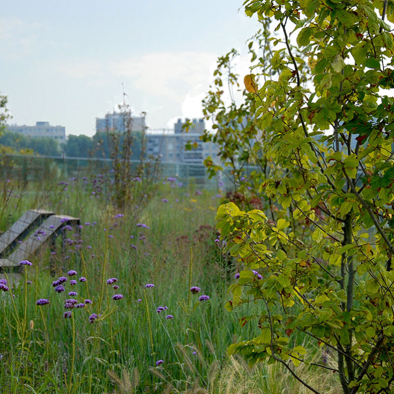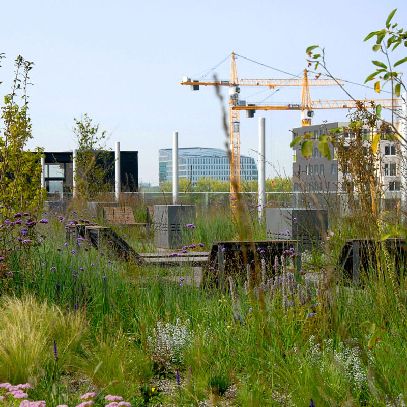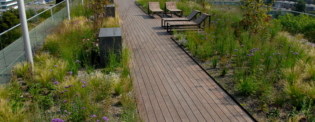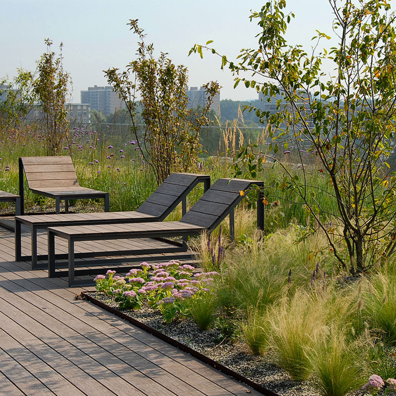 We plaatsten een Polderdak® systeem, een groen dak met onder de substraatlaag een extra laag om regenwater vast te houden. Het regenwater wordt gebruikt voor de bewatering voor de vele planten in deze tuin. Dit dakpark bestaat uit maar liefst 450 m2 groen en 250 m2 terras. Voor dit groen hebben we een uitgebreid beplantingsplan gemaakt met een mix van siergrassen en inheemse planten. Doordat de beplanting hoog is zijn er privé plekjes gecreëerd en zit je als bezoeker van het dak snel beschut. Een bijzonder element van dit park zijn de shuntkanalen die uitgevoerd zijn met verlichting aan de binnenzijde, zodat deze ’s avonds oplichten. Dit dakpark is een heerlijke plek voor de bewoners om te vertoeven.