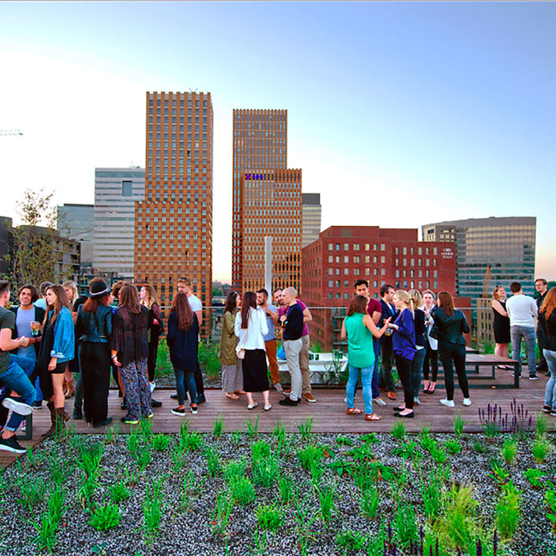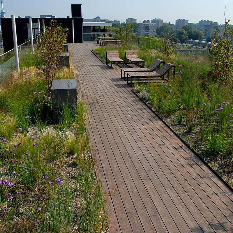 Het gerenoveerde wooncomplex De Boel van Vesteda aan De Boelelaan heeft een dak van 700 m2 die fungeert als gezamenlijke daktuin voor de bewoners.
