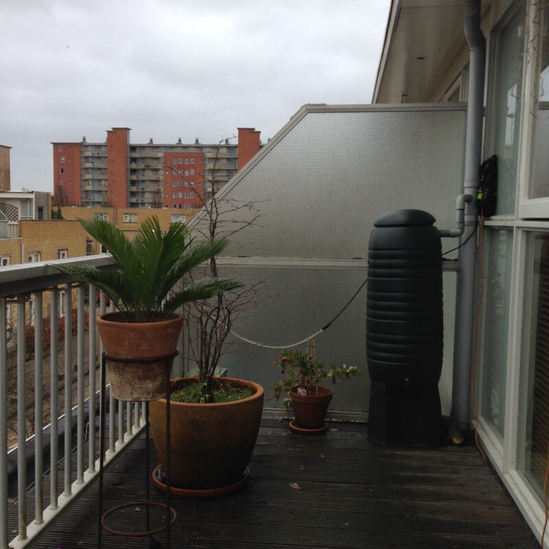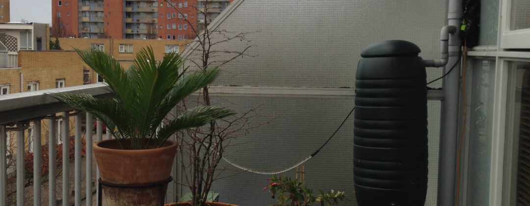 Tien jaar geleden heb ik een regenton aangeschaft om water voor de kamerplanten en de tuin te kunnen opvangen. Het water dat overloopt als de ton vol is en de rest van het regenwater dat op het dakterras valt wordt in de plantenbak in de voortuin geïnfiltreerd.