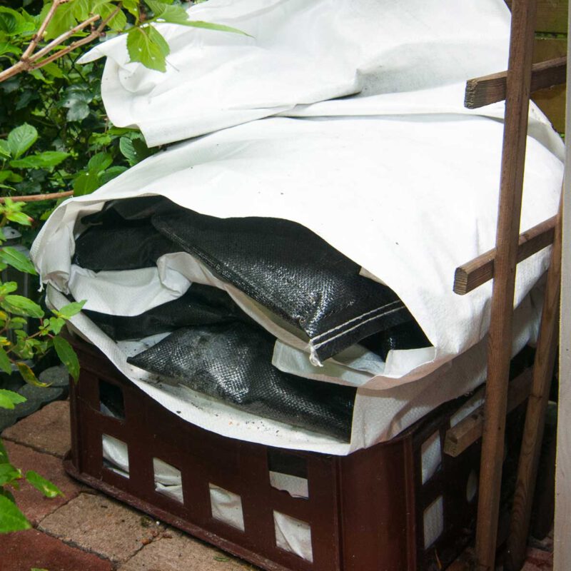 In het deurkozijn zijn twee sleuven aan weerszijden geplaatst, waar een houten schot ingeschoven kan worden. De houten plank is op maat gemaakt. In de tuin liggen zandzakken. Deze wegen 7,5 kilo per stuk zodat de eigenaresse ze in haar eentje kan optillen. De zandzakken dienen als extra bescherming bij de voordeur.