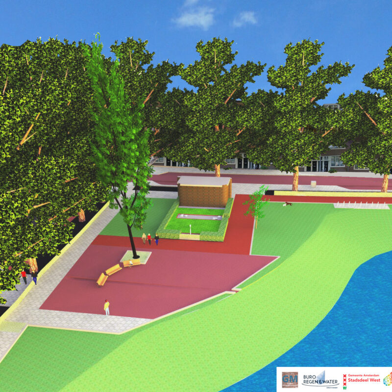 Het Erasmuspark in Amsterdam West is niet alleen een park maar ook een polder, een stadspolder: een laaggelegen park met daaromheen dijken, een ringvaart en een gemaal om de waterstanden te regelen. Een echte ‘stadspolder’ dus. Het pleintje dat werd aangelegd naast het Gemaal Mercatorstraat is het eerste ‘regenplein’ in dit deel van Amsterdam.