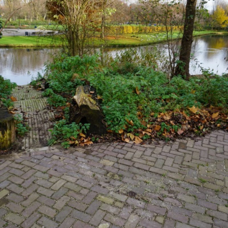 Arnoud Hekkens: “Er is een klein regenbestendig pleintje met een lange buurt-bank en een weids uitzicht over het Erasmuspark. De plaskrul is verdwenen, helaas, vanwege gebrekkig onderhoud.”