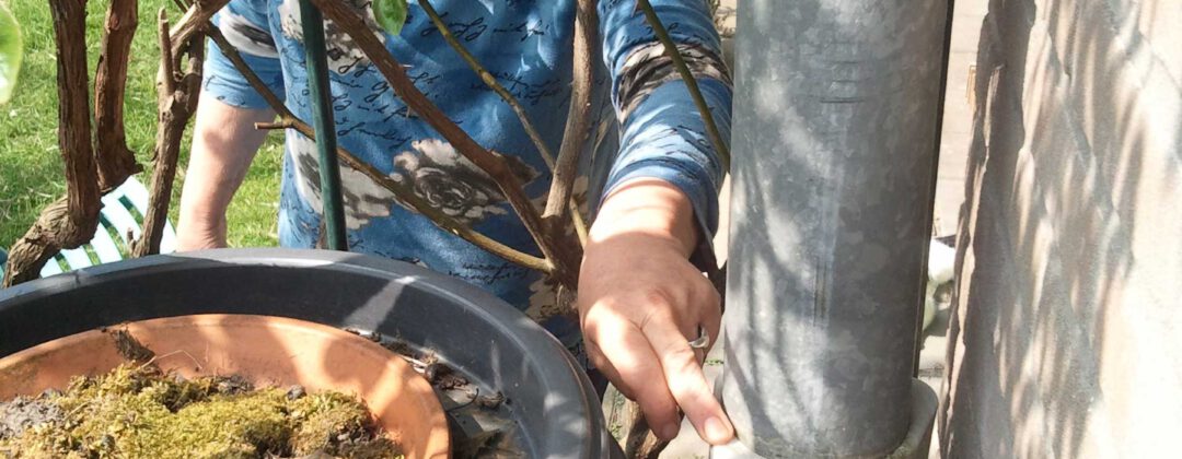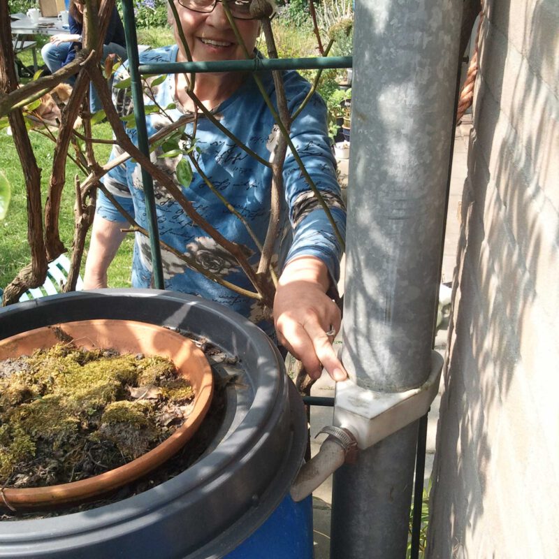 In overleg met de Vereniging van Eigenaren heeft huurster Annelies in 2006 een regenpijp, die in haar achtertuin de grond in loopt, doorgezaagd en van een tussenstuk voorzien. Dat tussenstuk brengt het regenwater naar een fikse regenton. Als die zou lopen, loopt het tussenstuk over en loopt het regenwater toch weer rechtstreeks het riool in. Maar eerst wordt iedere regenbui “gebufferd” in haar regenton. Natuurlijk staat er een grote plantengieter paraat onder het kraantje van de regenton! De ton krijgt zo amper kans om vol te lopen! Het zachte regenwater is ideaal voor de planten.