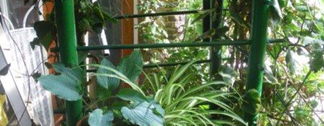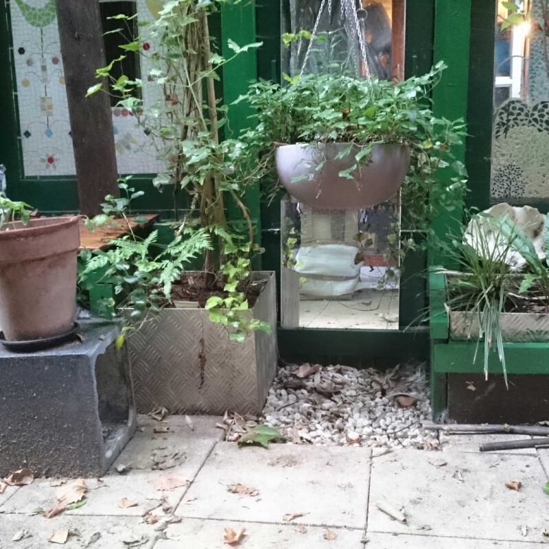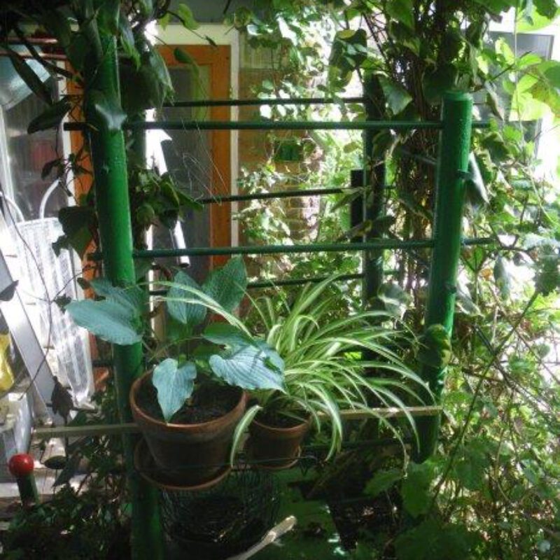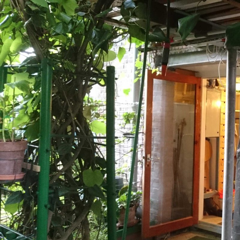 De schaduwrijke tuin, ca. 5 meter bij 4 meter, ligt aan de noordkant. De planten in de tuin heeft Toon al in de 80er jaren geplant. De meeste klimplanten, zoals de Duitse Pijp (Aristolochia macrophylla) zijn in de jaren geleidelijk gegroeid en komen nu tot aan de zolder.