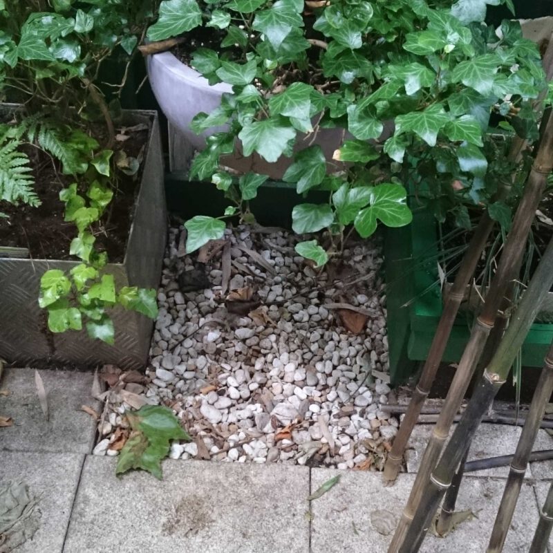 De plataan verliest veel bladeren in de herfst. Het is lastig vegen met een waterdoorlatende grindvloer. Daarom is er gekozen voor tegels die vanaf het huis aflopen naar achteren. Daar is een grindput waar het water instroomt. De grindpunt voorkomt wateroverlast na een hevige bui, de tuin staat niet blank.