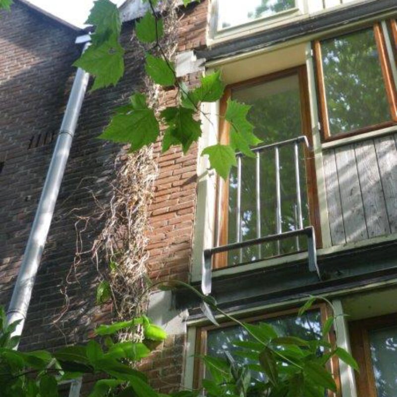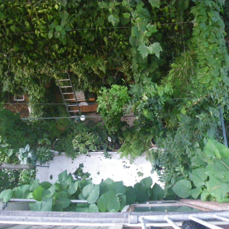 De regentuin in hartje Pijp is een kleine groene oase in de versteende omgeving. Klimplanten, bomen, een grindput, en een toekomstig te plaatsen regenton zorgen voor goede wateropvang en – afvoer.