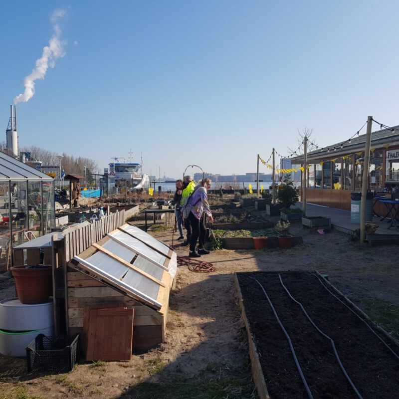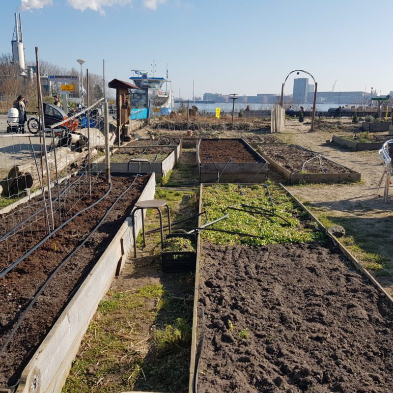 Naast het strandpaviljoen ligt de MoestuinderIJ. Twee keer per week wordt hier samen met de buurt gemoestuinierd. Het eerste jaar kwamen ze erachter dat er nog veel puin in de grond zat. Daarom werken ze met verhoogde moestuinbakken. Hier willen ze verandering in brengen, het creëren van een gezonde bodem, het vergoten van de biodiversiteit en circulair te werk gaan staat centraal. Er is een bloemenlint ingezaaid en er zijn fruitbomen gepland. Er zijn varkens waarvan de mest een jaar lang wordt bewaard om vervolgens compost van de maken.