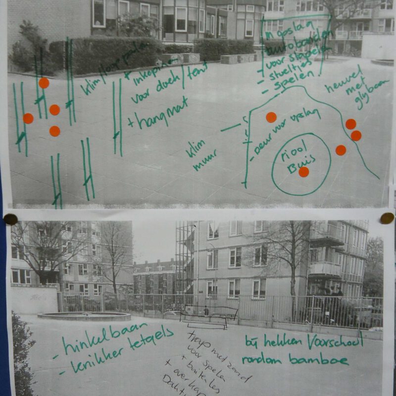 Het team raakte enthousiast en begon zelf te ontwerpen. Op foto’s van het oude plein hebben ze de ideeën ingetekend. Het werd al gauw duidelijk dat ze met zijn allen op één lijn zaten. Ze wilden meer spelaanleidingen, meer variatie en een gezelliger plein met planten, bomen en bankjes, met plekken om te rommelen en onderzoeken.