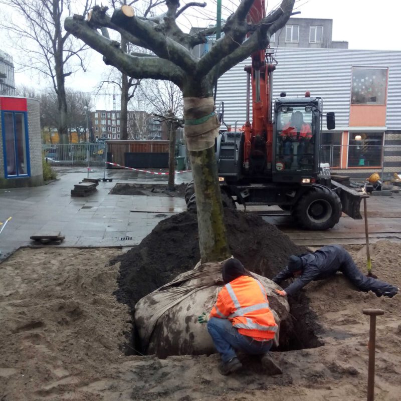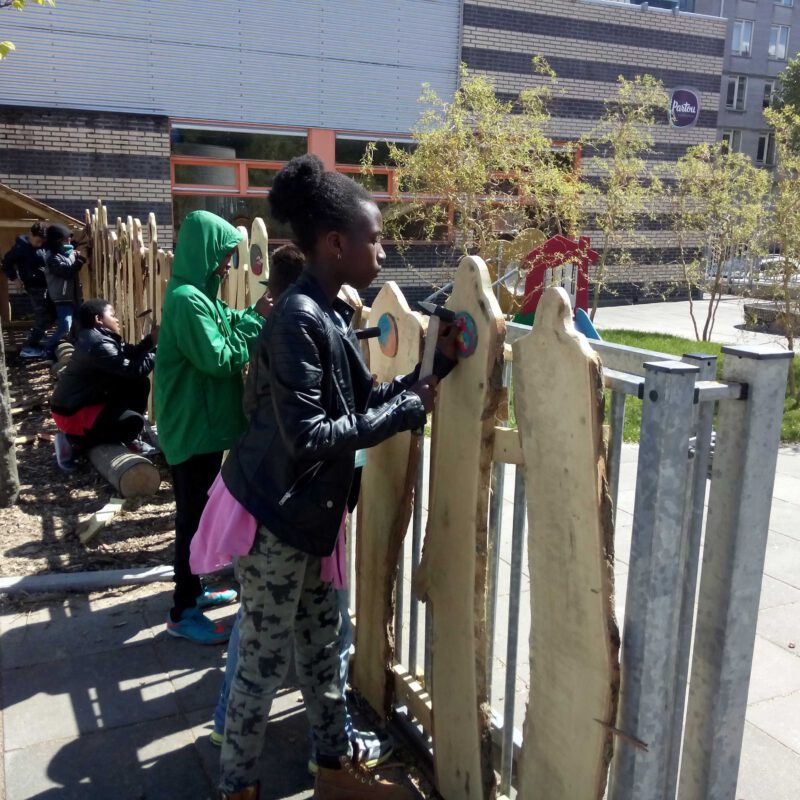 Het laatste deel van de inrichting gebeurde in samenwerking met de firma Stadshout. Zij verwerken gekapte Amsterdamse bomen tot bankjes, hekwerken, speelhuisjes, etc. Samen met de kinderen bouwden zij boombankjes om de nieuwe parasolplatanen heen, zijn er bijenhotels gemaakt, is er geverfd, geschuurd, geschaafd en gesjouwd.