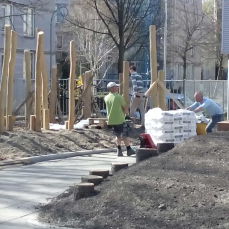Hoog tijd dus om dat te veranderen. En dat is gelukt! Inmiddels hebben er bulldozers gegraven, zijn er tegels opgestapeld in de vorm van een zitbank, houtsnippers gestort, beplanting en klim- en klauterstructuren aangebracht.