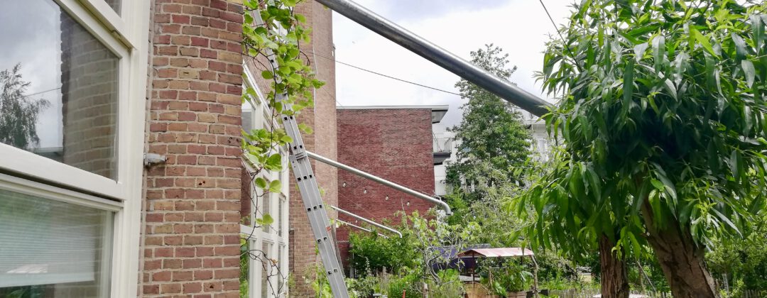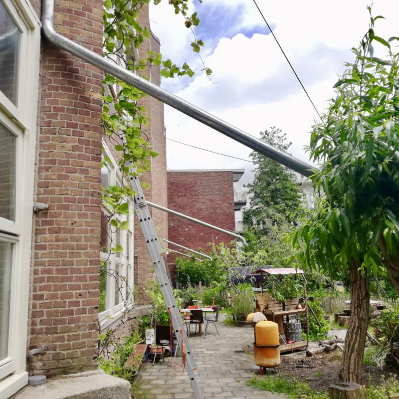 Aan de noordkant van het gebouw is er ook een regenpijp afgekoppeld. Deze regenpijp gaat eerst onder de grond, waarna het stromende regenwater terecht komt in een open goot. Deze goot is ook nog functioneel, zo zijn er hier fietsenrekken boven geplaats. Aan het einde van open geul stroomt ook dit regenwater in een wadi.