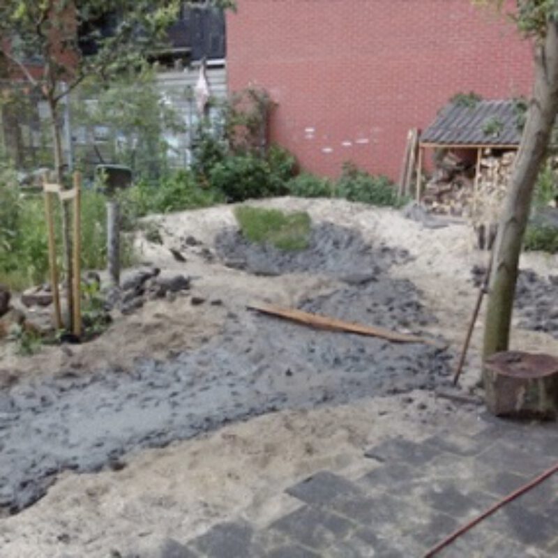 Van hergebruikte tegels van het voormalige schoolplein is een ronde zitkuil gemaakt. Deze zitkuil heeft ook als functie om water op te slaan. In de kelder onder de gymzaal staat vaak grondwater. Het idee is om dat water te leiden naar deze zitkuil. Hier kan het water vasthouden worden. Wanneer er veel water in de zitkuil komt, kan het naar de naast gelegen wadi stromen.