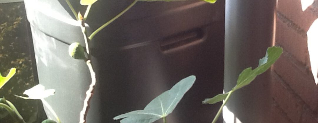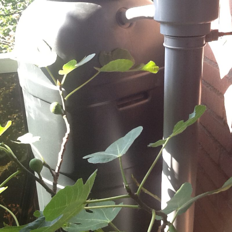 Ik heb een regenton, gekocht via BM winkels, geïnstalleerd met een capaciteit van 100 liter. Op een warme dag heb ik drie emmers voor mijn planten nodig. Ik kan dus drie dagen vooruit zonder geslouw met emmers en gebruik van kraanwater. En voor het eerst ben ik eens blij als het regent. Op dit moment staan er twee rozen langs een muur, vier tomatenplanten, een clematis Princess Diana (rood!), een vijg (zichtbaar op de foto) en wat kruiden.