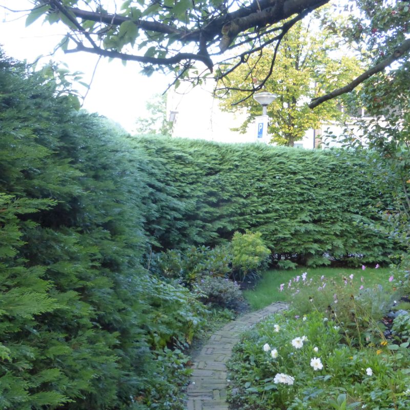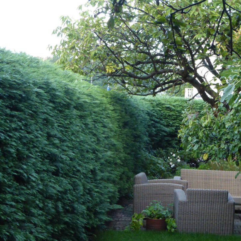 De coniferenhaag om de tuin vreet heel veel water en daardoor moeten we het gras erg vaak besproeien.