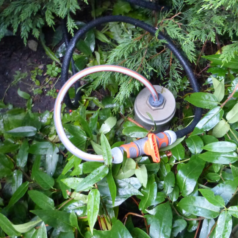 Een regenton van 400 liter (50cm doorsnede, 2.15m hoogte) kon precies in een doods hoekje van de haag geplaatst. Dit is de buffer die het regenwater opvangt vanaf het dak van de garages. Aan het kraantje van de regenton is een 35 meter lange druppelslang bevestigd die onder de coniferenhaag ligt. Deze krijgt nu continu water. Deze slang eindigt precies bij een inspectiepunt van het riool in de tuin. Daar kan bij extreme regenval het teveel aan water worden afgevoerd. Door een afsluitbare koppeling aan het uiteinde van de druppelslang kan die worden geopend als dat nodig is.
