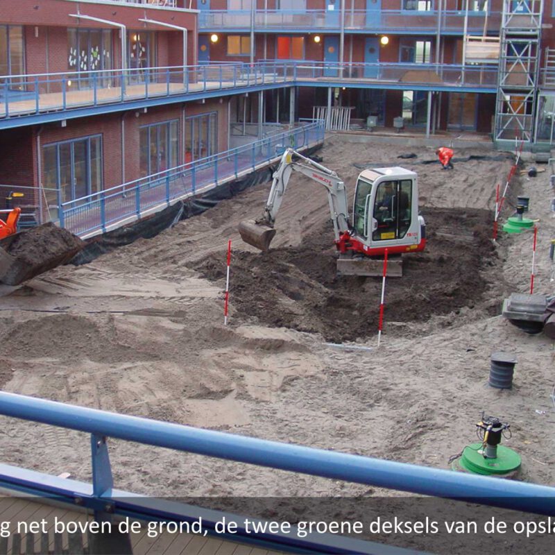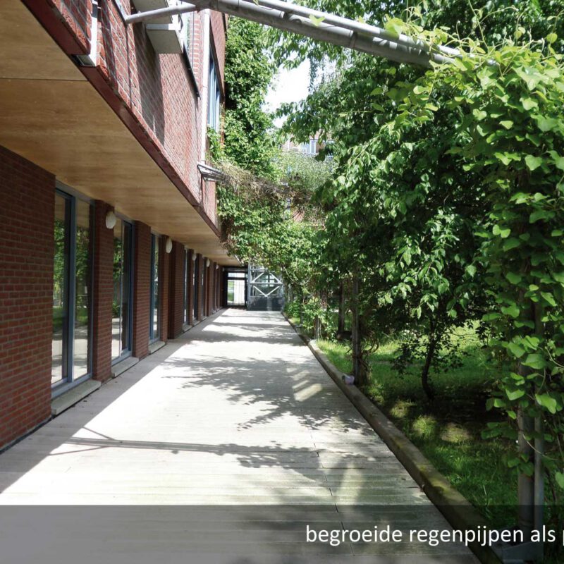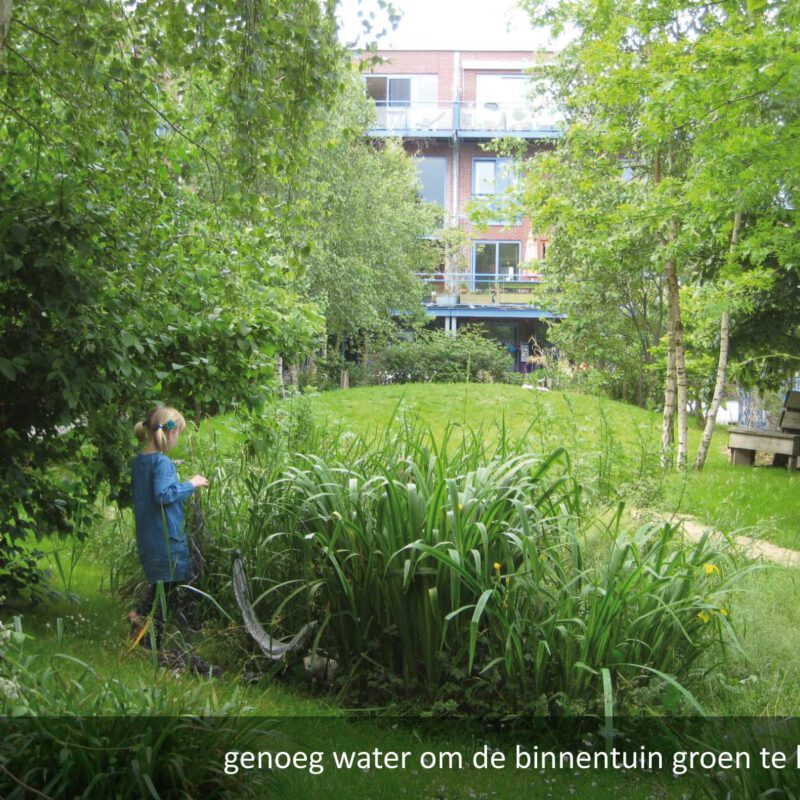 Het gebouw bestaat uit een ‘gesloten bouwblok’ van 3 tot 4 lagen hoog met een binnentuin van 50 x 18m. De woningen worden ontsloten vanaf de binnentuin, waardoor de binnentuin ook een plek is waar je elkaar tegenkomt. Naast diverse andere milieuvoorzieningen is tevens aandacht besteed aan de opvang en het benutten van regenwater. De parkeergarage is onder de woningen opgenomen, waardoor de binnentuin uit ‘volle grond’ bestaat, waarin het regenwater kan wegzijgen. De binnentuin is ook bewust zo veel mogelijk onverhard gelaten en heel groen ingericht. Het ontwerp van de binnentuin is gezamenlijk met de (toekomstige) bewoners gemaakt. Het regenwater van de dakvlakken wordt opgevangen in twee tanks die in de binnentuin zijn ingegraven en in totaal 6.000 liter water kunnen bevatten. Dit water wordt gebruikt om in de zomer de bomen, struiken, planten en het gras mee te besproeien. Ook worden de vele pot- en kuipplanten van de bewoners ermee begoten. Gebleken is dat het opgevangen regenwater in de meeste jaren net voldoende is. Door de toepassing van opgehoogde en uitgegraven delen in de binnentuin stroomt het meeste regenwater dat in de tuin valt naar een lage moerasachtige plek, waardoor er naast meer droogteminnende soorten ook vochtminnende soorten groeien. Tot slot zijn de regenpijpen op de onderste verdieping losgemaakt van de gevel, waardoor de opeenvolgende afvoerpijpen een soort pergolaconstructie vormen, waar klimplanten in groeien en eventuele lekkages in de afvoeren niet op of langs de gevels plaatsvinden.