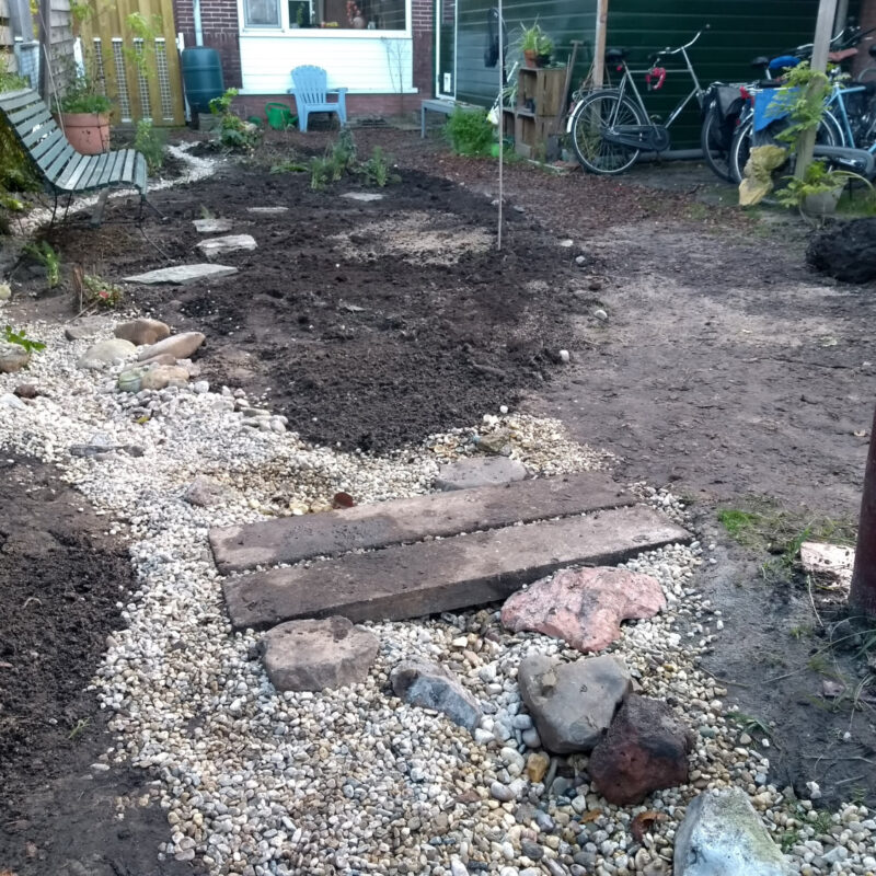 Voorheen was de hele tuin betegeld, de aarde was jarenlang samengeperst en er was geen bodemleven. Dit maakte het onmogelijk voor regenwater om in de grond te zakken tijdens een bui. Door tegels uit de tuin te halen is er ruimte voor groen gekomen en zoals Suzanne in haar blog schrijft: ‘Om regenwater af te voeren, moet er gegraven worden!’.