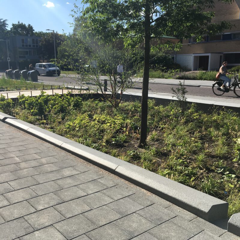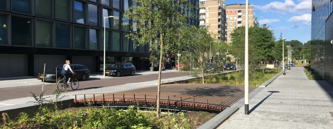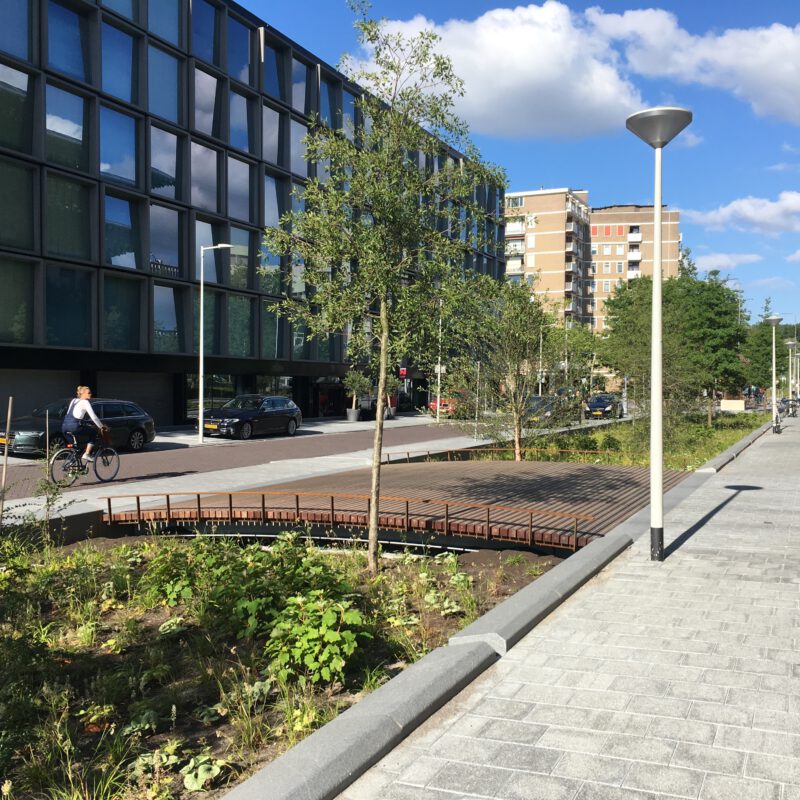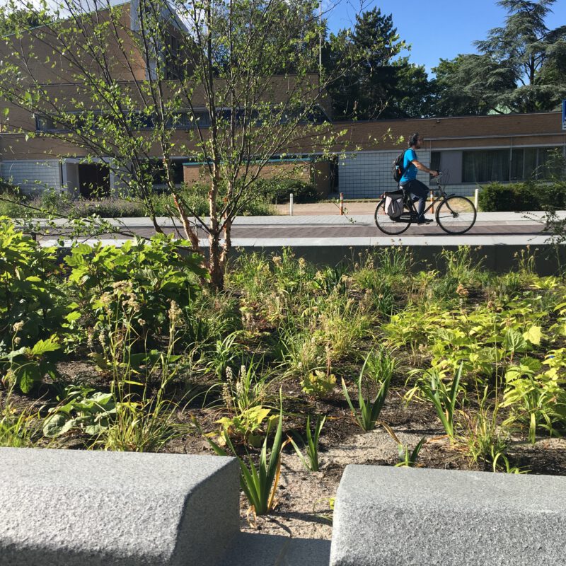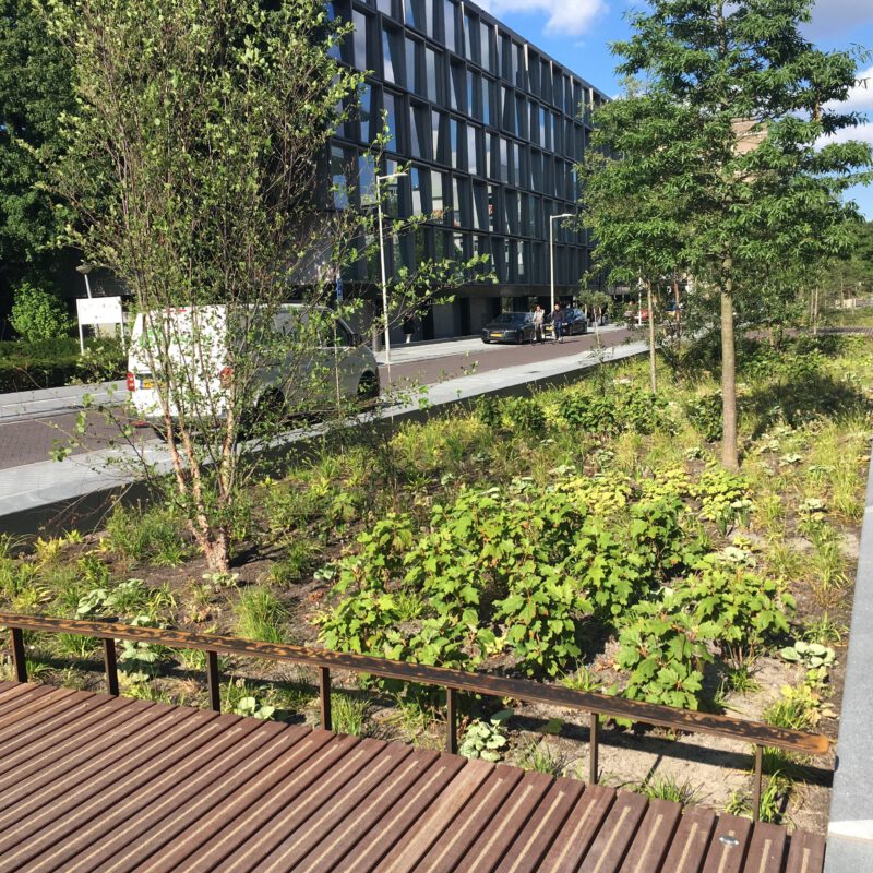 Tijdens het ontwerp van deze groenstrook is er rekening gehouden met de hevige neerslag maar ook met de structuur van het gebied. De groenstrook bestaat uit planten en varens die goed tegen natte voeten kunnen. Hierdoor is er meer biodiversiteit in de betonnen wereld van de Zuidas, wat weer positief bijdraagt aan de hittestress.