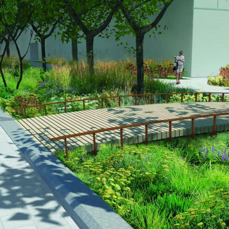 Meerdere jaren is er hard gewerkt om een groenstrook op grote schaal te ontwerpen die bijdraagt aan het regenwaterprobleem in de stad. De voornaamste functie voor de verlaagde groenstrook is het bergen en vertraagd afvoeren van het regenwater. De regen zal door de beplanting in de groenstrook worden vastgehouden om het rioolstelsel te ontlasten. De begroeiing zal gedurende hevige neerslag niet al het regenwater kunnen opvangen, maar het draagt wel degelijk bij vertraagd afvoeren. Aan het ontwerpproces van de groenstrook hebben zo’n 20 specialisten meegewerkt. Hierbij is rekening gehouden met het maaiveldhoogte, bodemopbouw en de afvoersystemen.