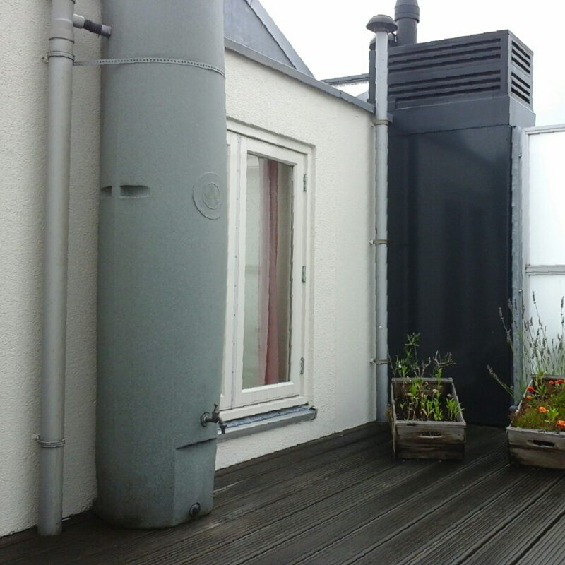Ik heb een regenwaterzuil op mijn balkon die 400 liter regen kan opvangen. De regenwaterzuil is aangesloten op de regenpijp. De vulautomaat zorgt ervoor dat de ton gevuld wordt tot een maximum niveau, komt het daarboven dan vloeit het water weer gewoon af via de regenpijp.