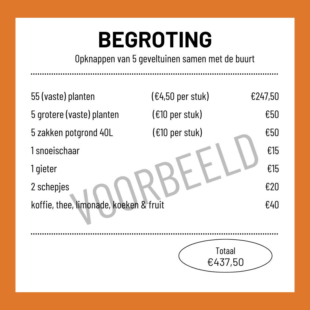 Elk jaar is er een bedrag per wijk beschikbaar – op is op en elke aanvraag wordt afzonderlijk beoordeeld of het nog binnen de budgetten en plannen van het jaar past. Dit budget kan je ook inzetten om geadopteerde boomspiegels in de straat mee op te knappen.