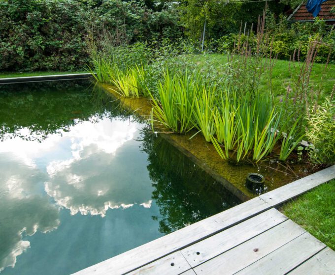 In een tuin vergt een goed beplante regenwatervijver relatief weinig onderhoud. Door begroeiing bezinkt verontreiniging, de planten breken de verontreiniging af en nemen het op.